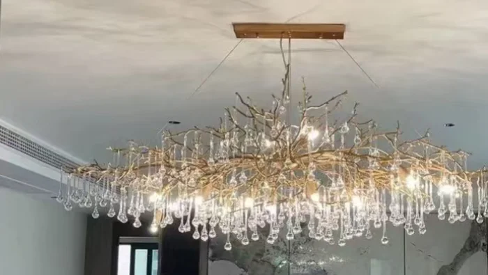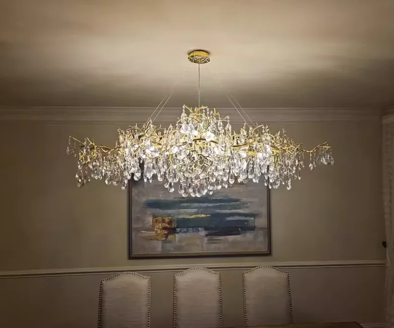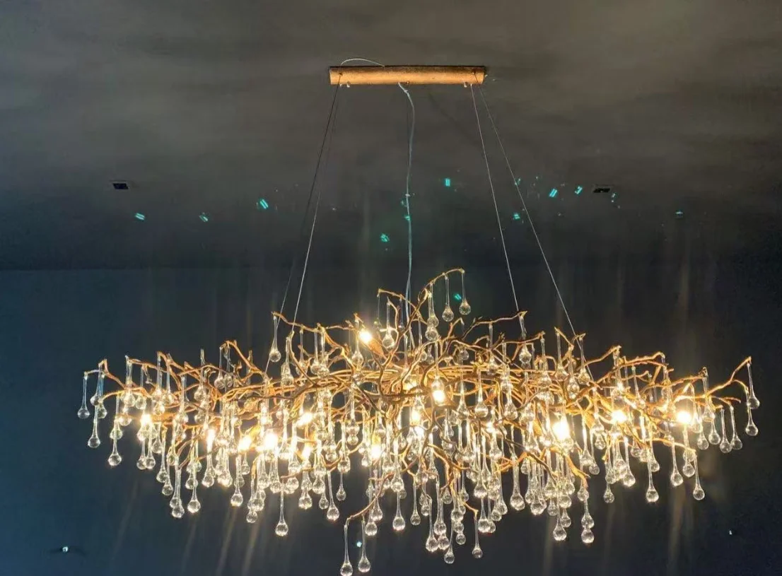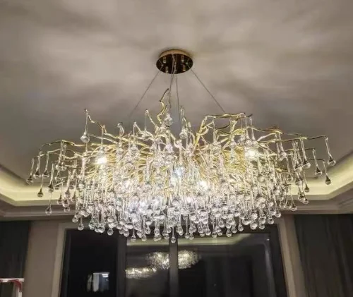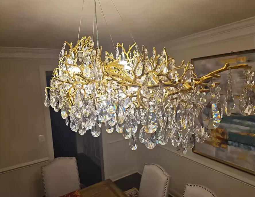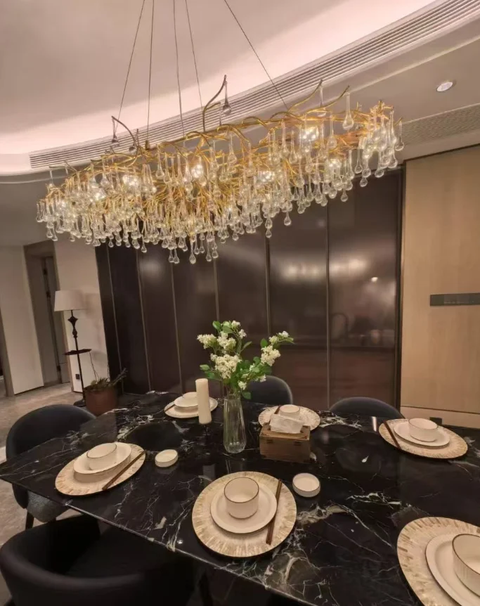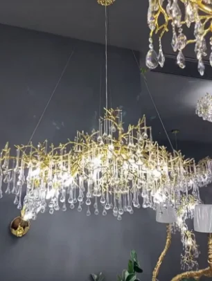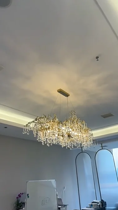 This stunning statement piece features a cascading design of shimmering crystals that beautifully reflect light, creating a glamorous and sophisticated atmosphere.