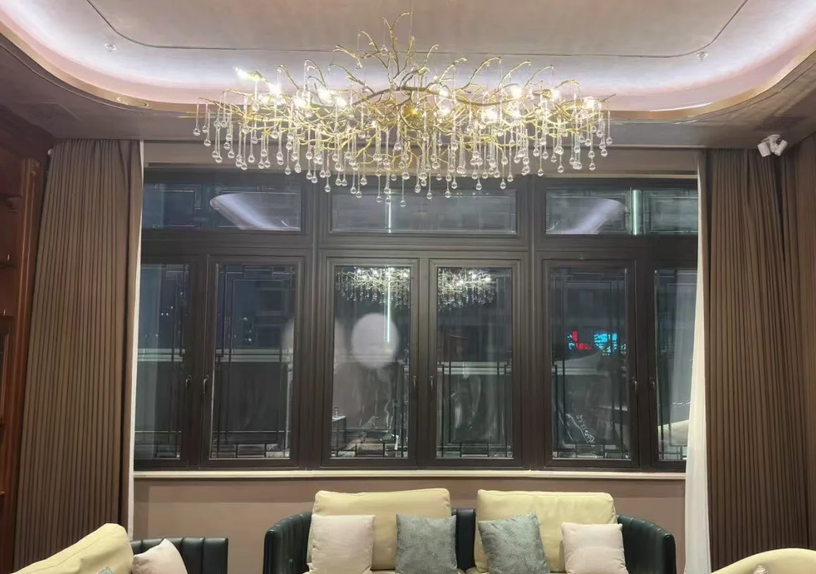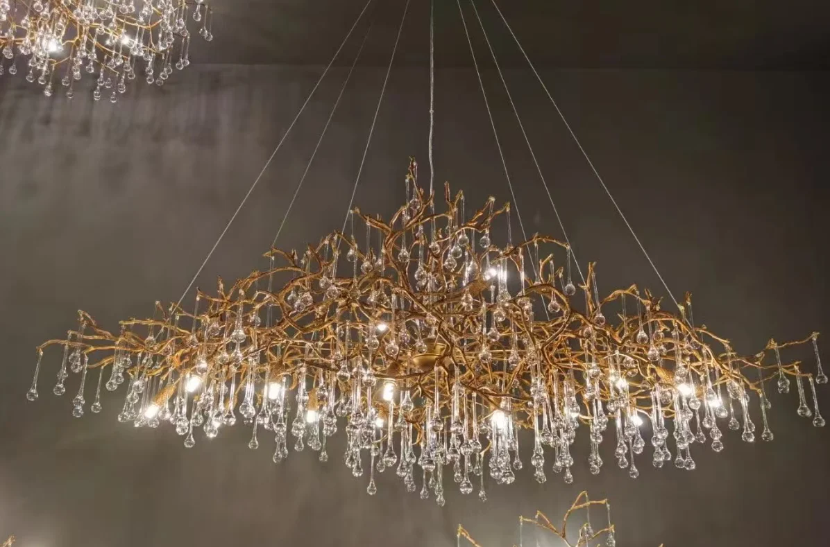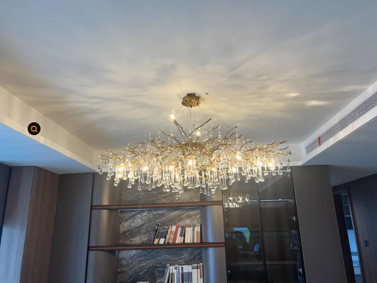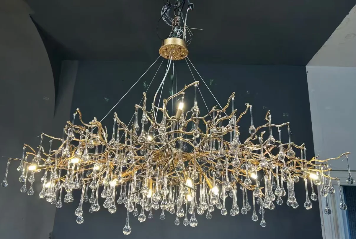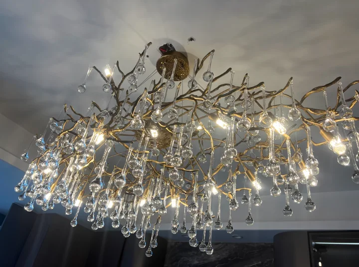 This stunning statement piece features a cascading design of shimmering crystals that beautifully reflect light, creating a glamorous and sophisticated atmosphere.