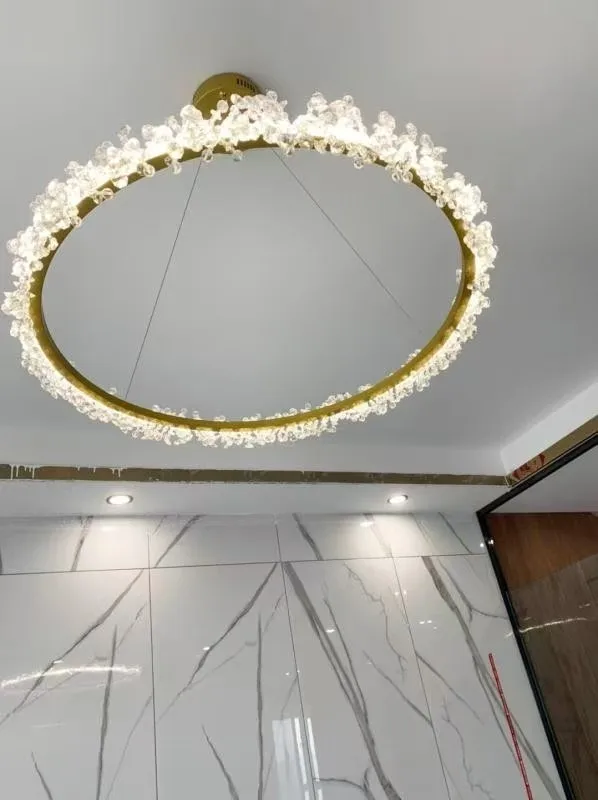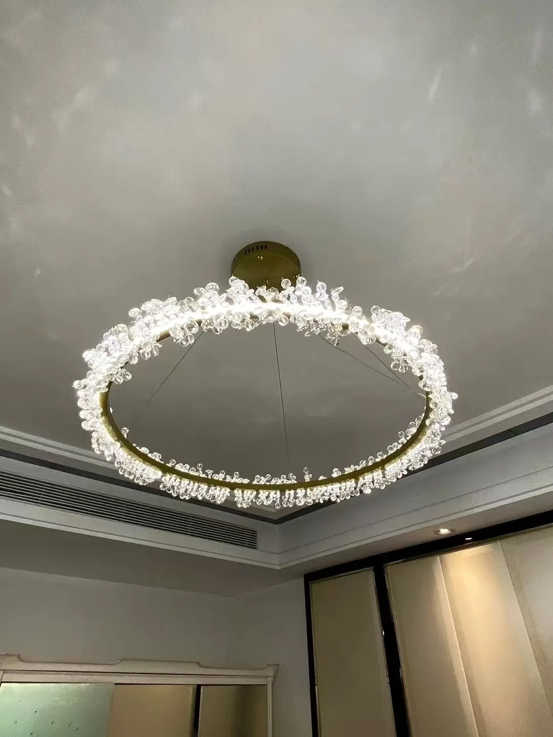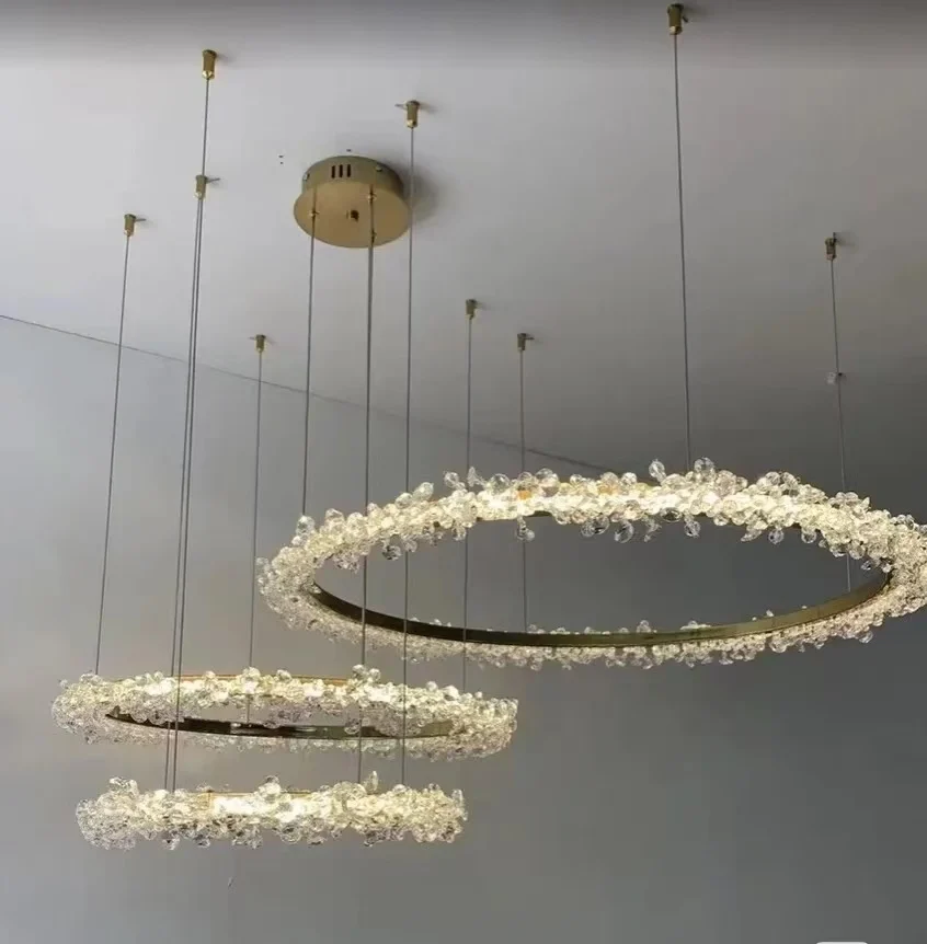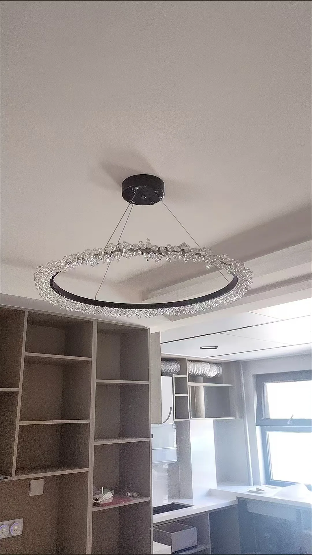 Available in sleek Black or luxurious Gold finishes, this captivating fixture features gleaming metal rings encrusted with shimmering crystal accents that mimic the delicate beauty of ice.