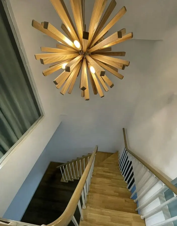 Expertly crafted with interlocking wooden slats arranged in a captivating starburst pattern, the ESTRELLA pendant light combines modern, rustic, and industrial elements for a truly striking design.