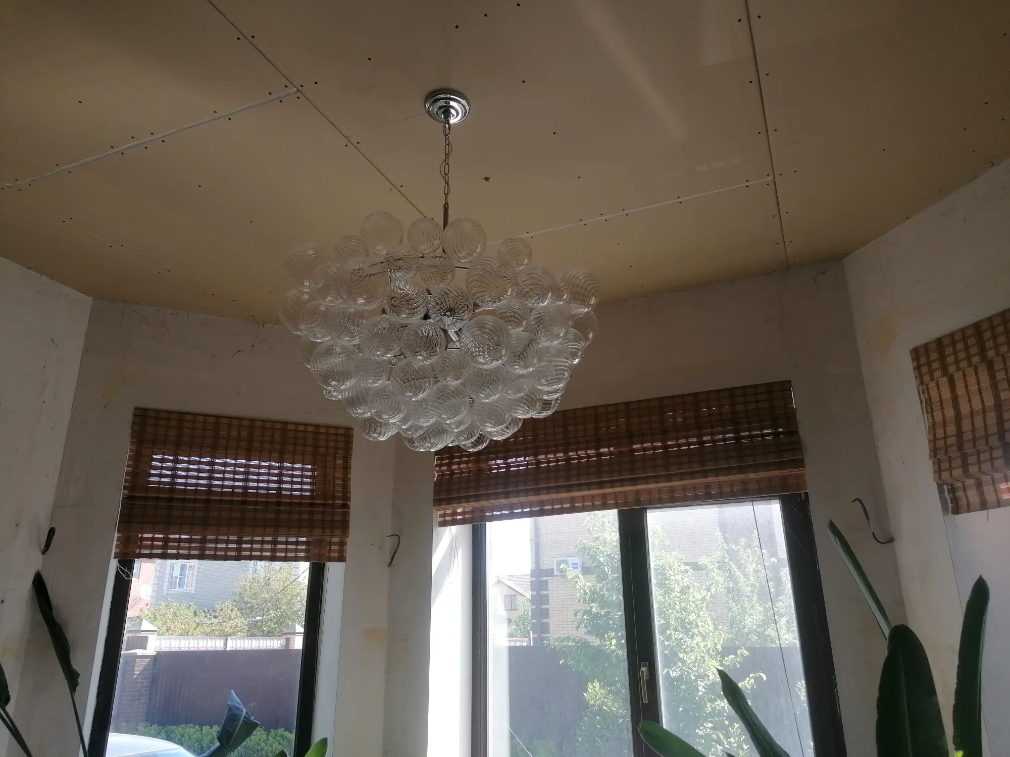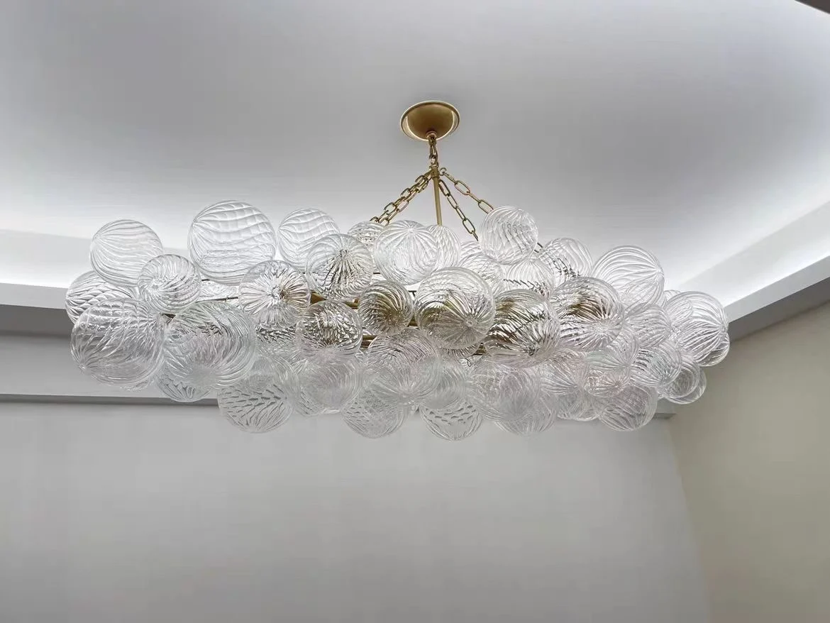 Crafted from exquisite hand-blown glass and premium metal, this statement piece features a cascade of delicate, textured glass globes that create a mesmerizing play of light and shadow.