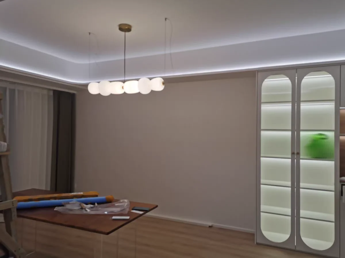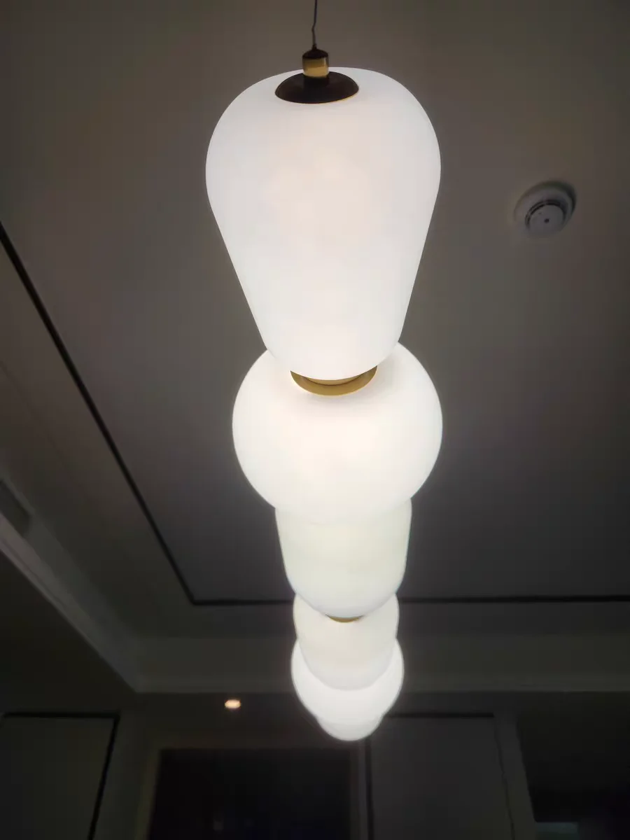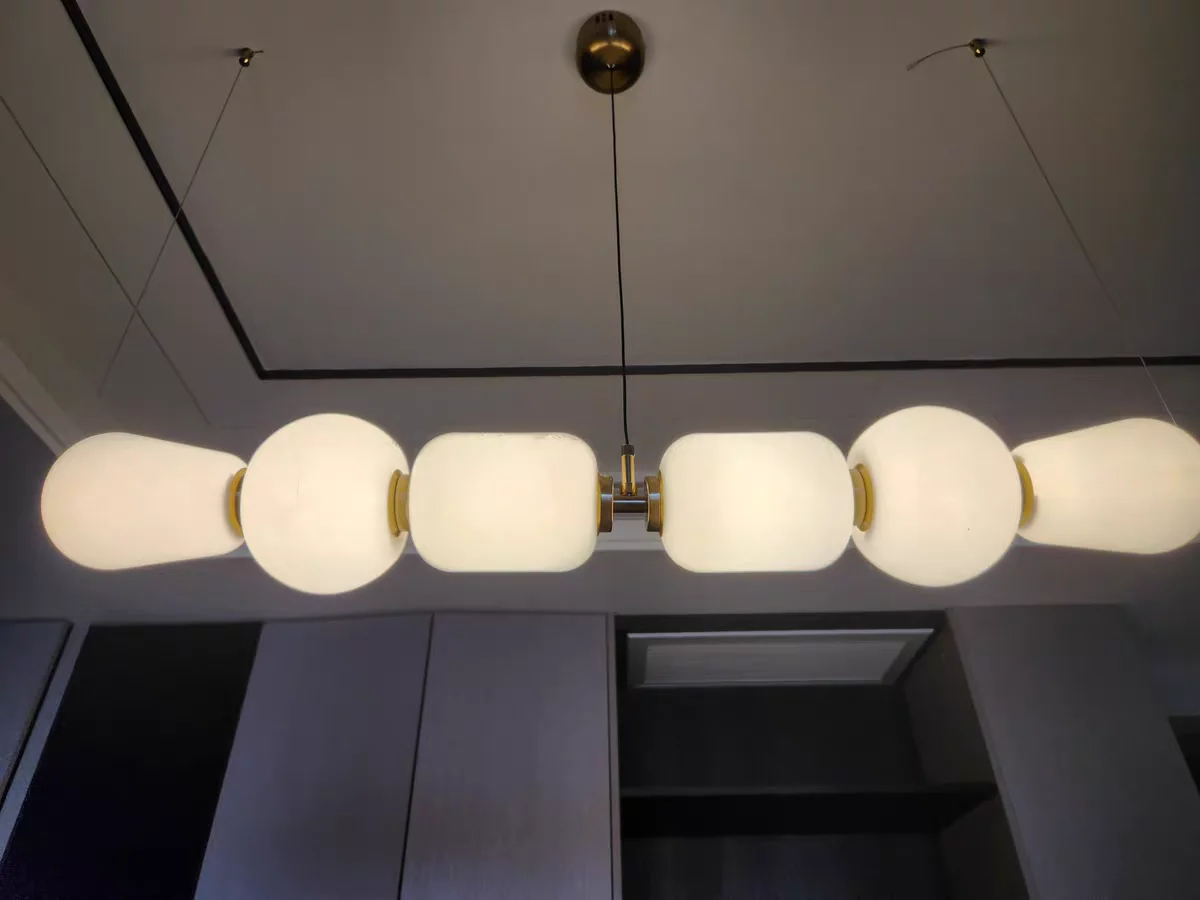 Featuring a unique sequence of organically shaped acrylic shades mounted along a streamlined metal rod, it delivers warm, diffused illumination perfect for dining areas, kitchen islands, or workspaces.