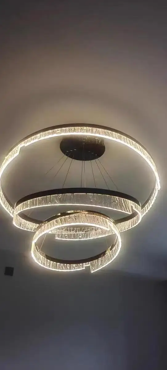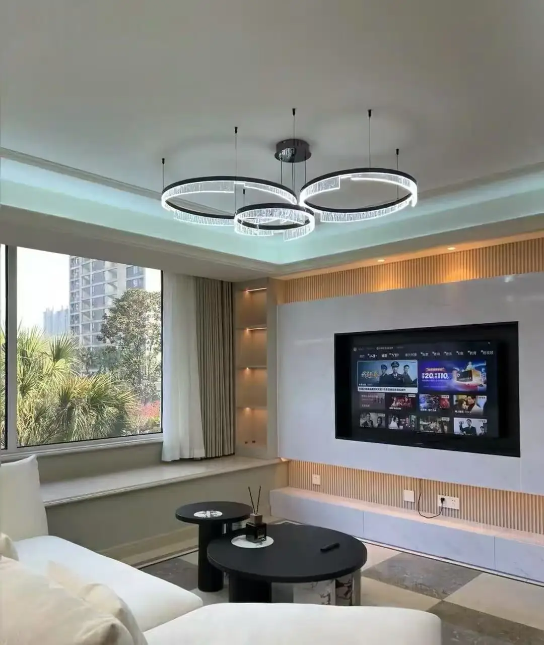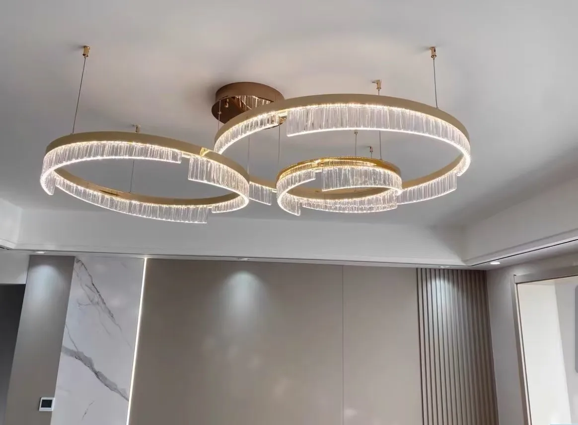 The suspended rings exude elegance with integrated LED lighting that offers both brilliance and energy efficiency.