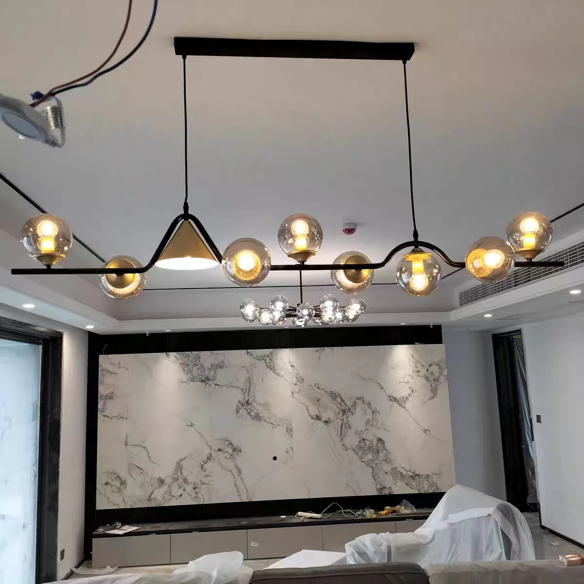 Crafted from high-quality aluminum and glass, this sophisticated fixture showcases a sleek geometric arrangement with opulent glass orbs, casting a warm and inviting glow.