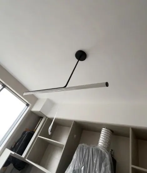 Its minimalist structure, featuring a straight, horizontal light bar suspended by a slim vertical stem, embodies sophistication and timeless style.
