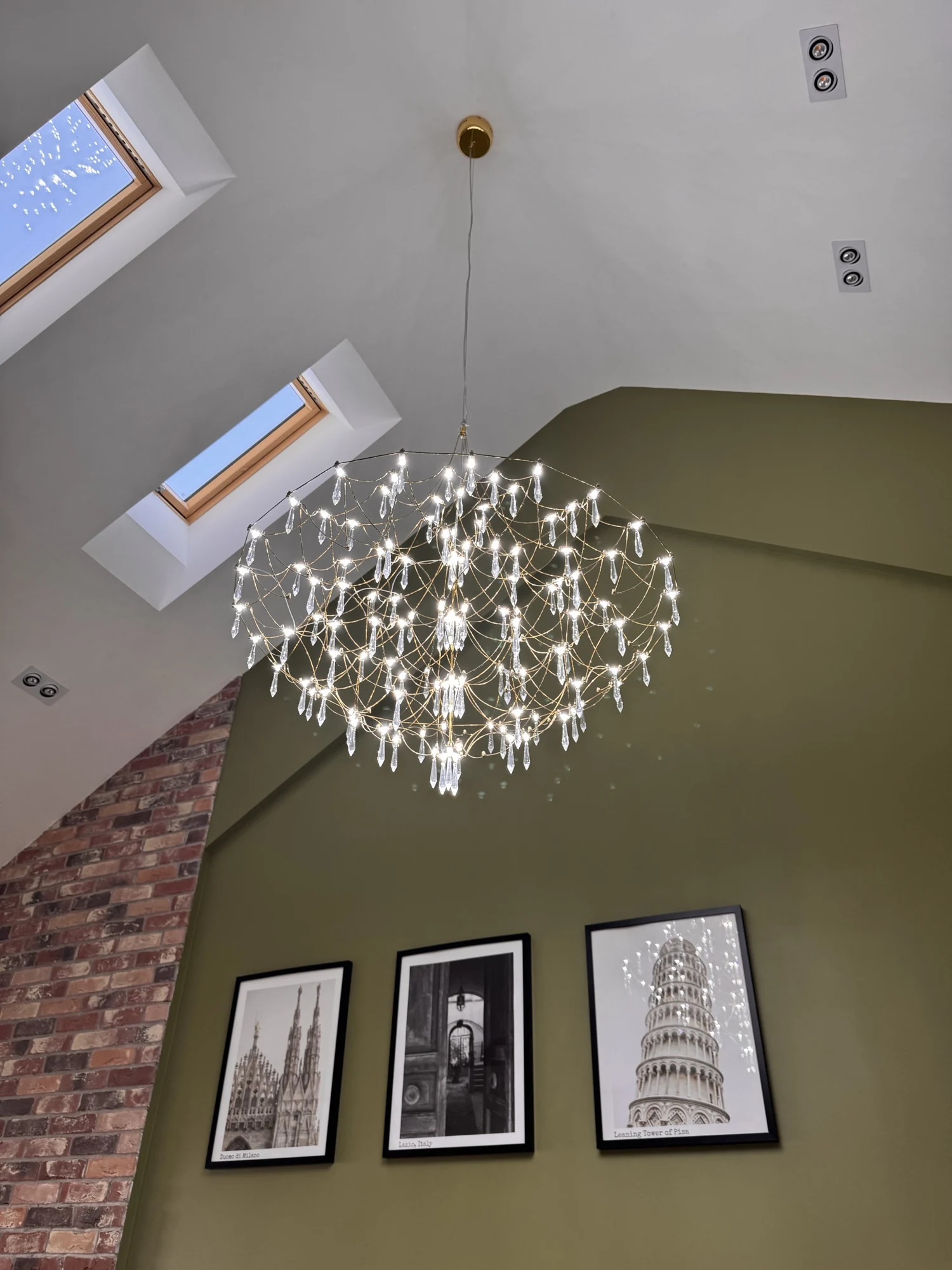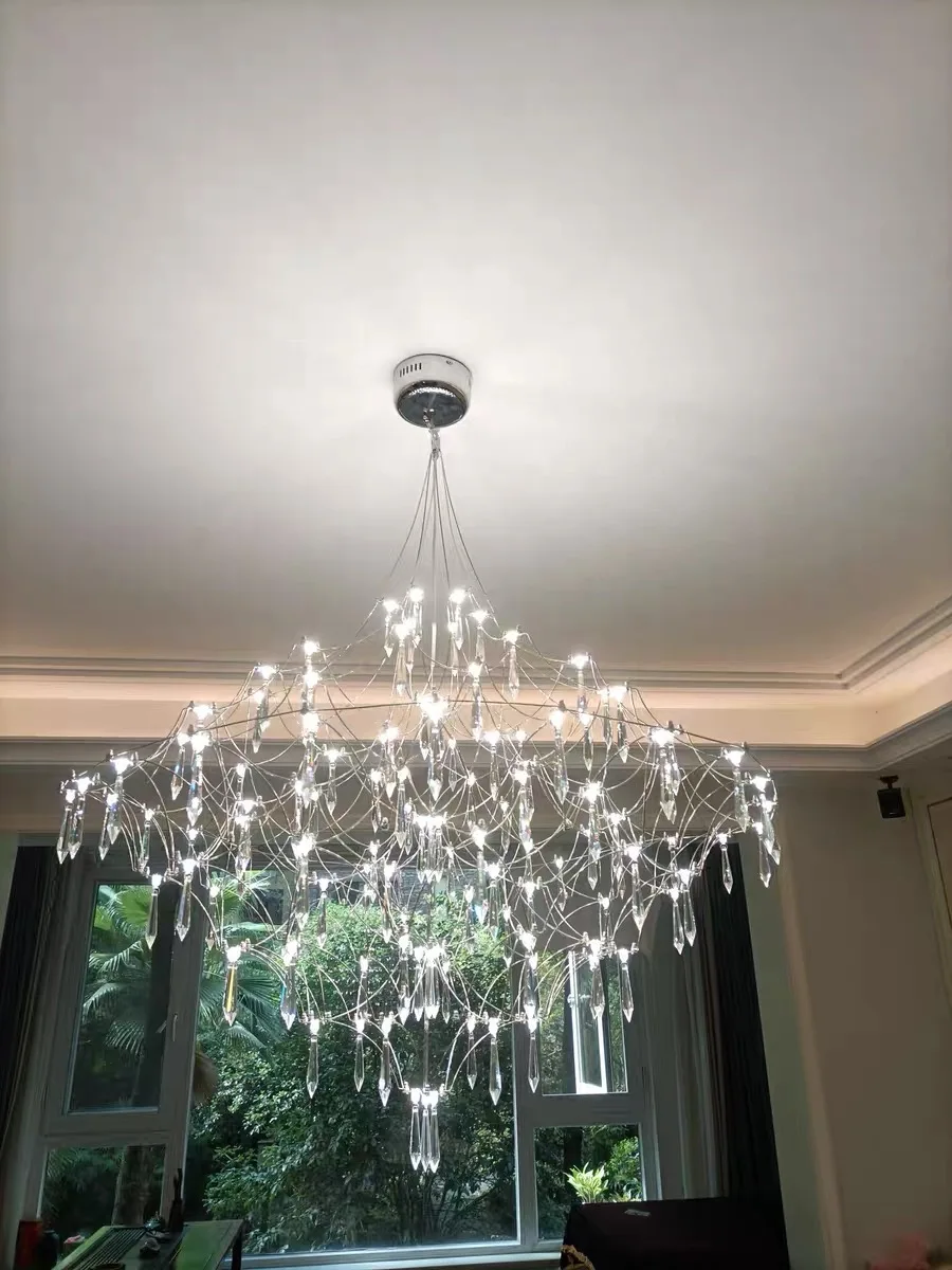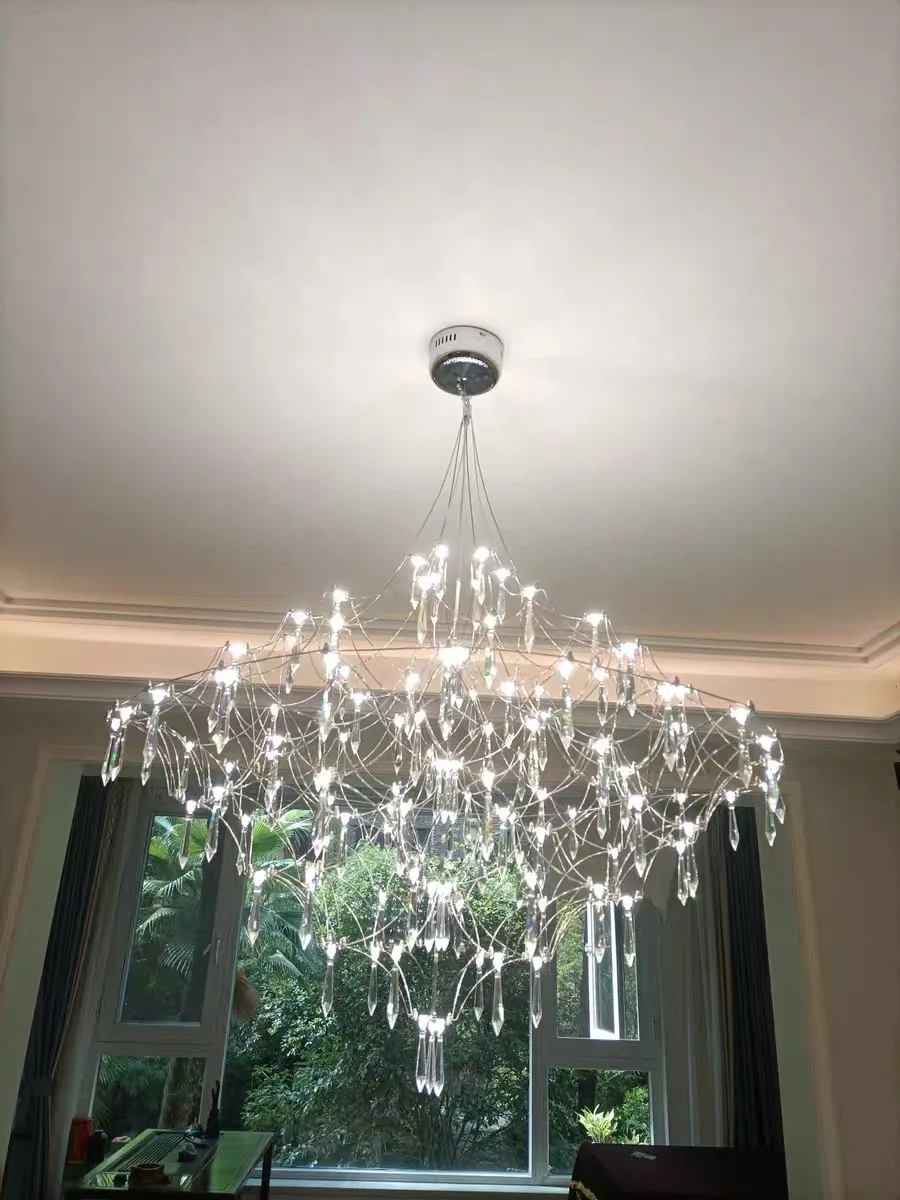 Its intricate web-like frame cascades gracefully, adorned with sparkling crystal drops that capture and reflect light beautifully, creating a luxurious and dynamic ambiance.