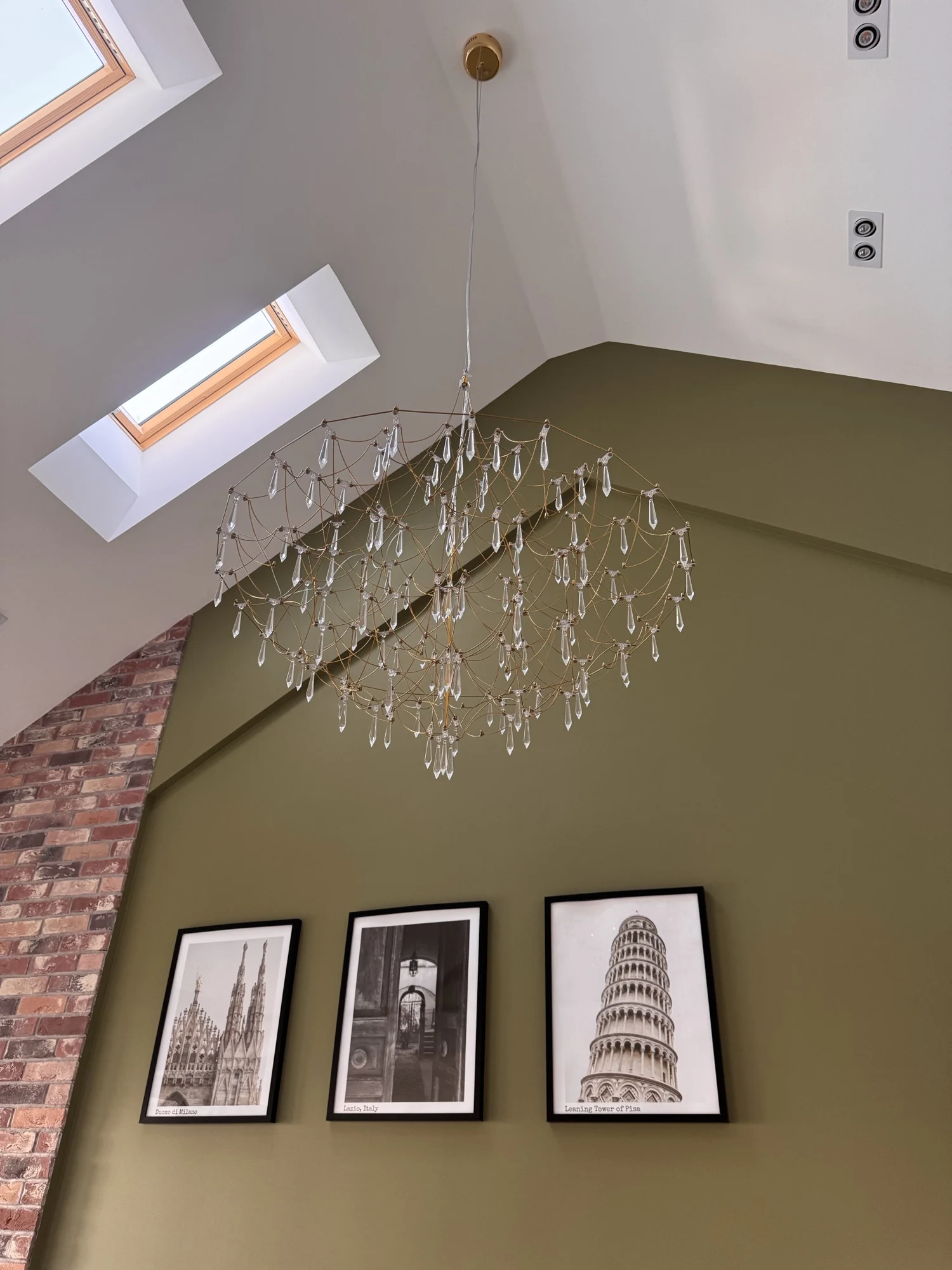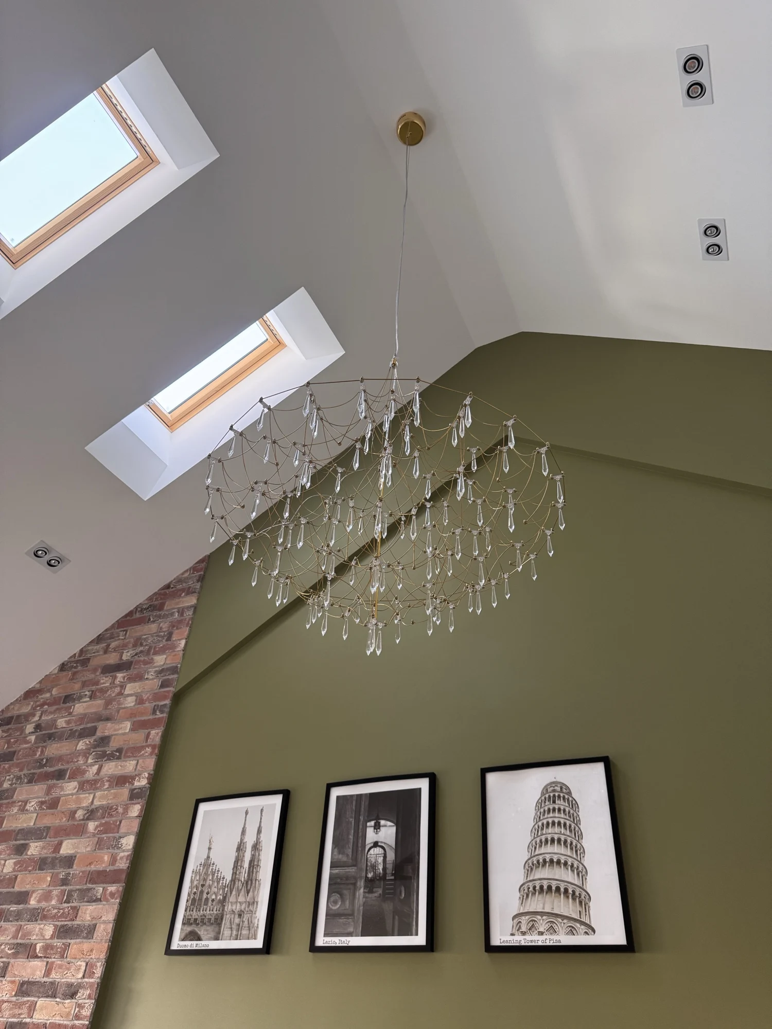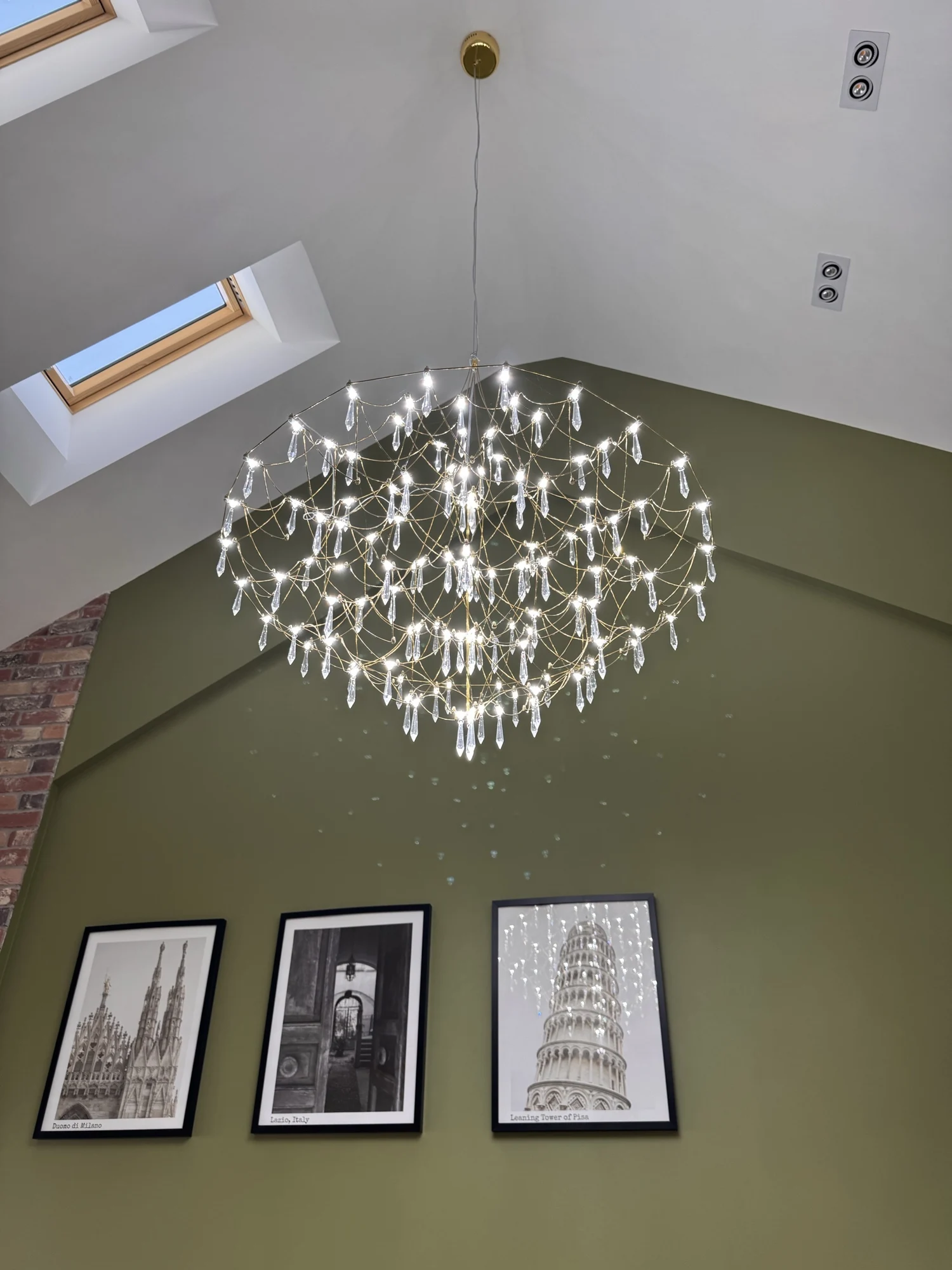Its intricate web-like frame cascades gracefully, adorned with sparkling crystal drops that capture and reflect light beautifully, creating a luxurious and dynamic ambiance.