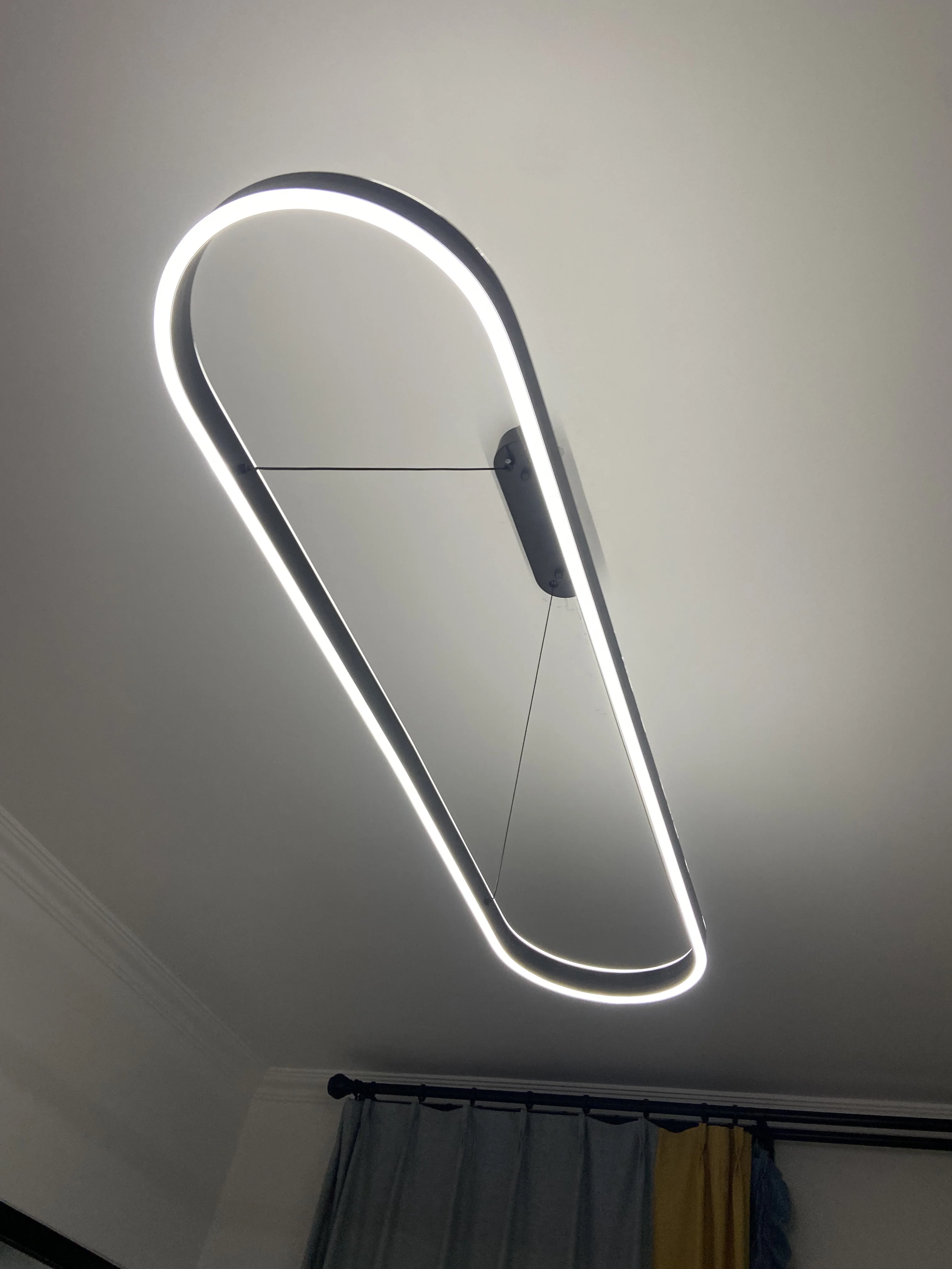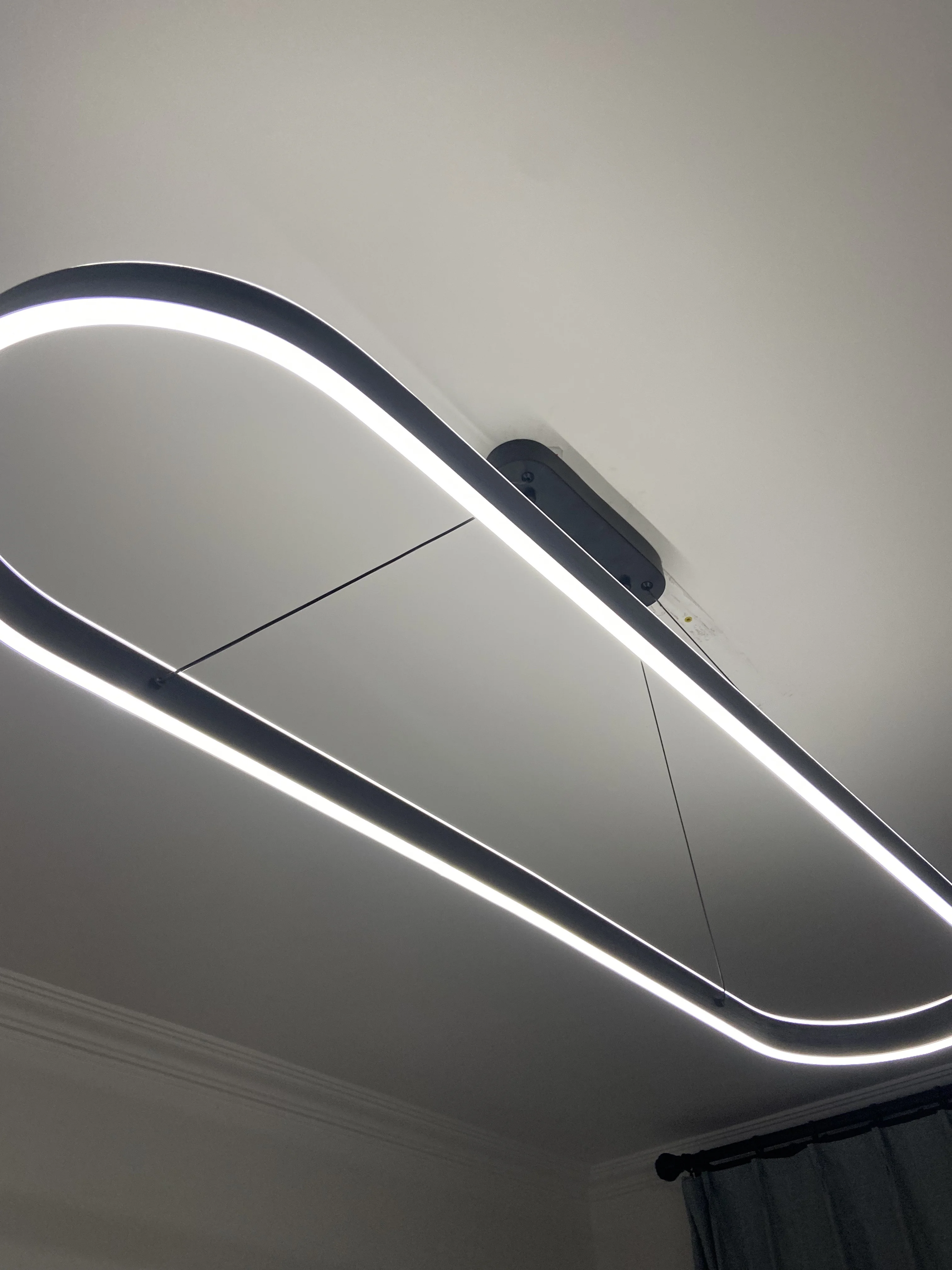 Its elongated oval silhouette, suspended elegantly by fine cables, adds a contemporary touch to dining areas, kitchens, and workspaces.
