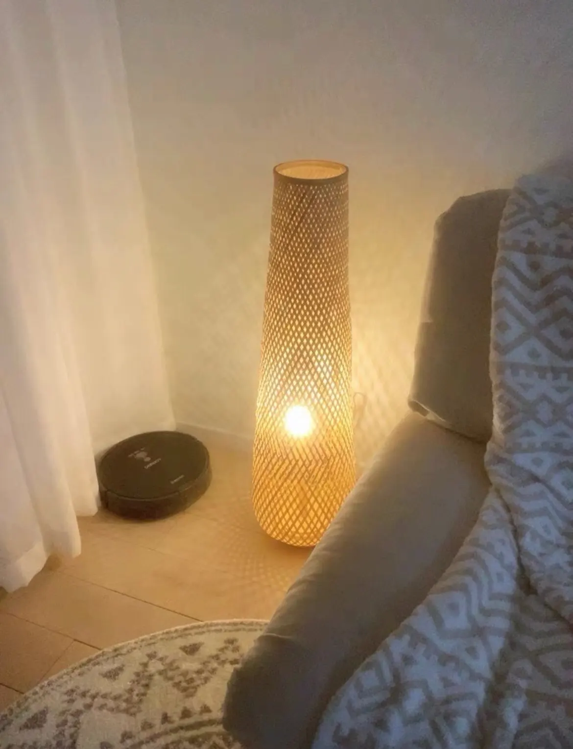 Expertly handcrafted from rattan and bamboo, the SAMU floor lamp boasts a sleek, elongated design and intricate geometric lattice pattern.