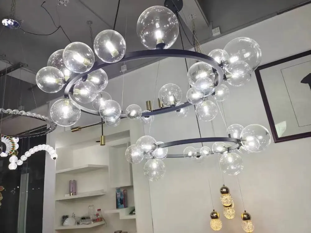 With glass ball lights and a black hollow disc, this statement piece will tickle your imagination and add a touch of intrigue to any space.