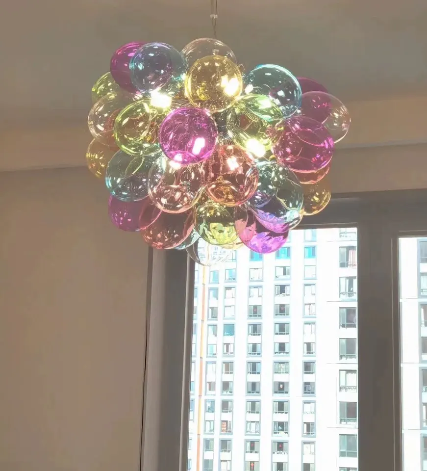 Hand-formed glass spheres in luminous candy hues sparkle around a sleek stainless frame, scattering warm, ambient light and adding instant personality to dining rooms, living spaces, bedrooms, and entryways.