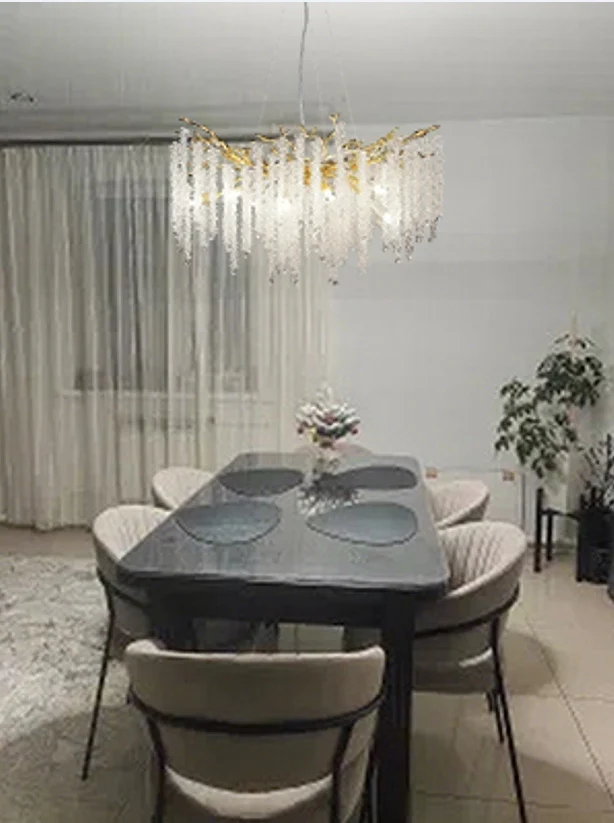 Crafted from premium crystal and aluminum, this stunning fixture features an intricate, branch-like frame adorned with cascading crystal strands, mimicking the delicate flow of willow leaves glistening in the light.