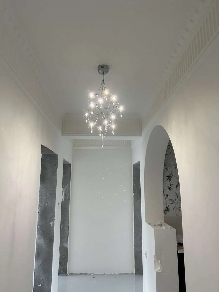 Its airy, lacework frame arcs into a graceful tiered silhouette, with pinpoint light sources and hand-faceted crystal drops that refract a warm, sparkling glow across dining rooms, living spaces, and grand entryways.